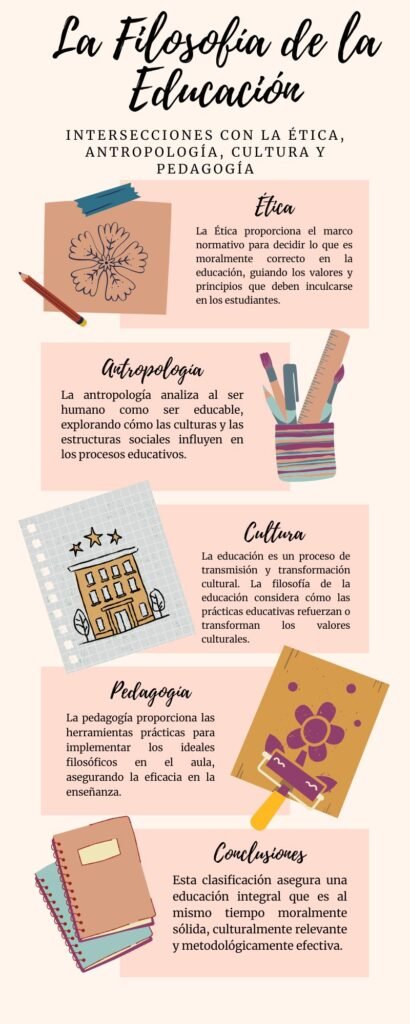 La ética establece el marco normativo que define los valores y principios esenciales para la educación, mientras que la antropología nos ayuda a entender al ser humano como sujeto educable, destacando su diversidad y su potencial. Por su parte, la cultura proporciona el contexto en el que se transmiten y transforman los valores y conocimientos, mientras que la pedagogía se encarga de traducir estas ideas en estrategias prácticas y efectivas.
